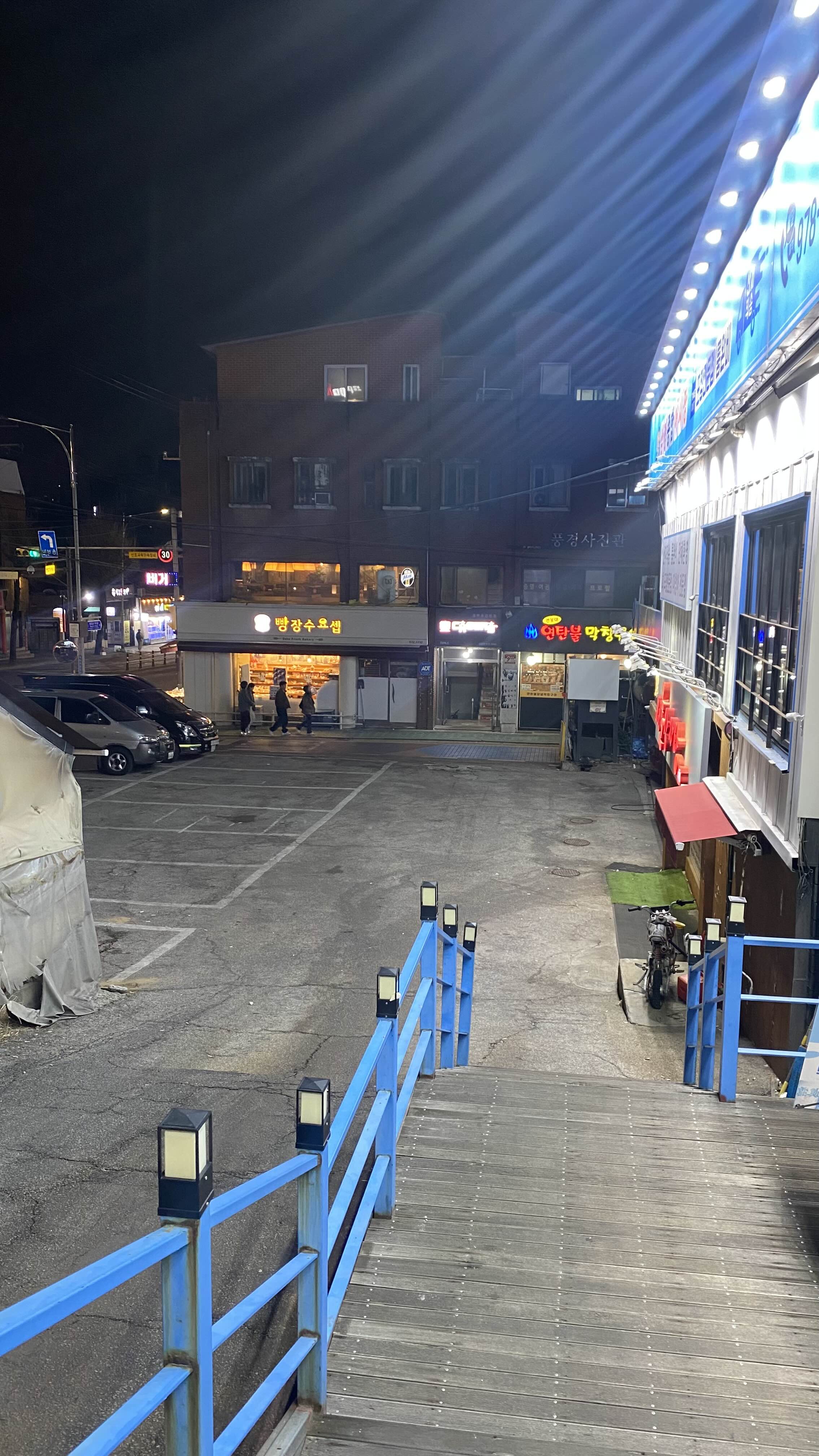 주차장 넓은 것 보이시나요? 날이 많이 따뜻해지면 플라스틱 의자로 야장도 펼치시는듯.. 흡연공간도 계단만 내려가면 가까우니 잘 마련되어 있고요.